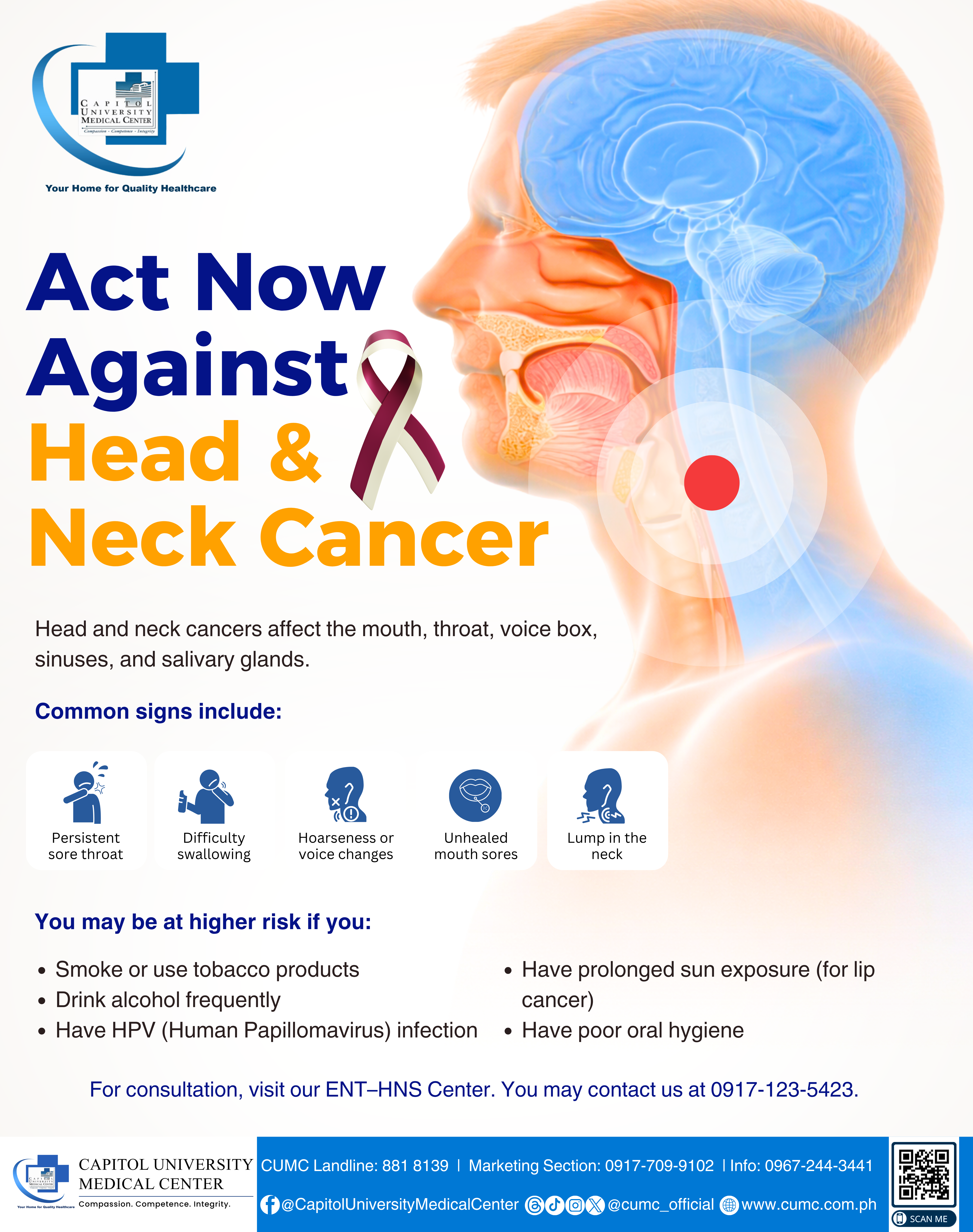 Capitol University Medical Center (CUMC) shines a light on the parts of you that help you speak, smile, eat, and breathe with ease this Head and Neck Cancer Awareness Month.