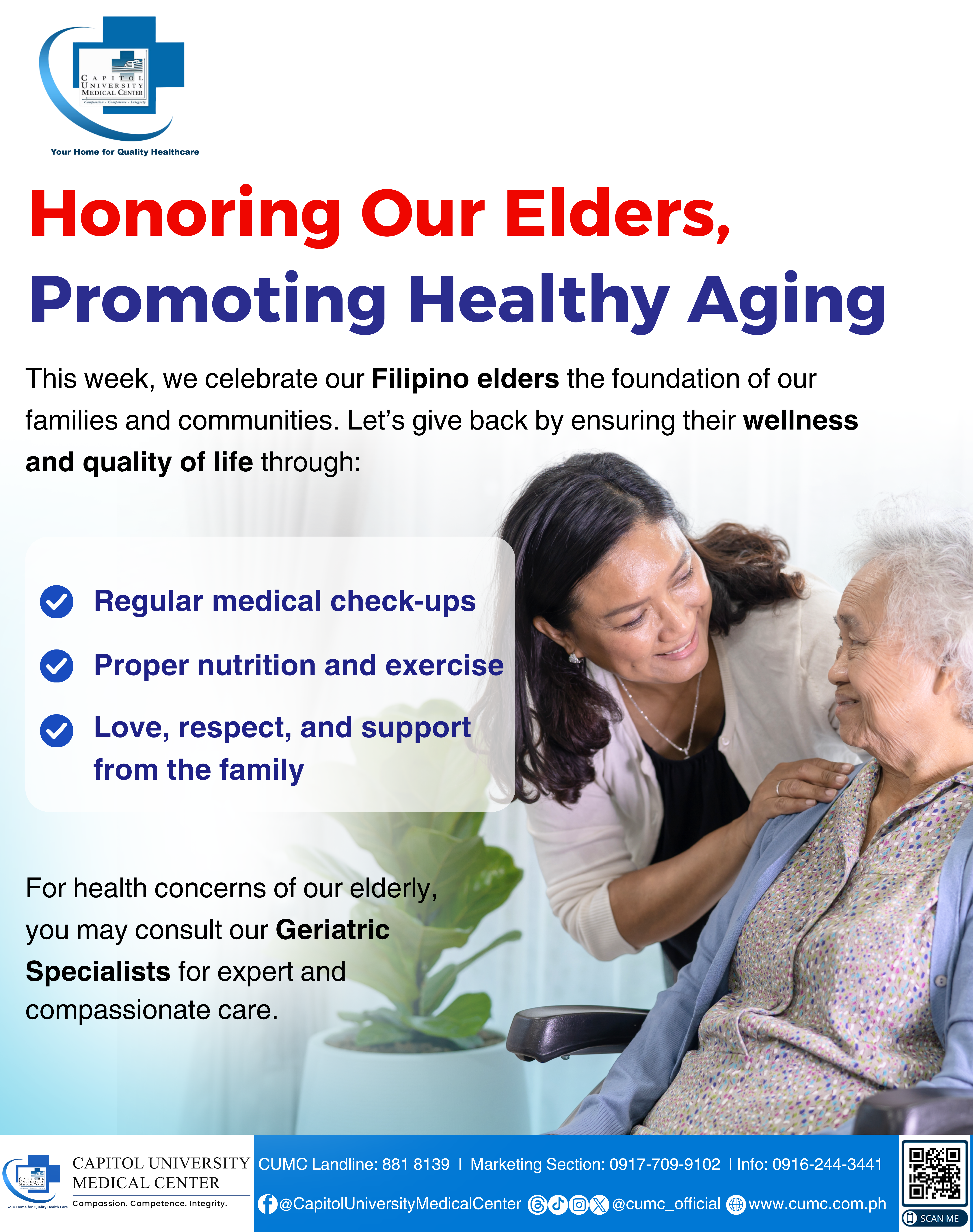 ๐๐ก๐ข๐ฌ ๐๐ฅ๐๐๐ซ๐ฅ๐ฒ ๐ ๐ข๐ฅ๐ข๐ฉ๐ข๐ง๐จ ๐๐๐๐ค, ๐ฐ๐ ๐๐๐ฅ๐๐๐ซ๐๐ญ๐ ๐๐ง๐ ๐ก๐จ๐ง๐จ๐ซ ๐จ๐ฎ๐ซ ๐๐๐ฅ๐จ๐ฏ๐๐ ๐ฌ๐๐ง๐ข๐จ๐ซ ๐๐ข๐ญ๐ข๐ณ๐๐ง๐ฌ ๐ฎ๐ง๐๐๐ซ ๐ญ๐ก๐ ๐ญ๐ก๐๐ฆ๐: โ ๐๐ฆ๐๐ซ๐๐๐ข๐ง๐ ๐๐ ๐: ๐๐ข๐ฏ๐ข๐ง๐ ๐ ๐๐ข๐๐ ๐ฐ๐ข๐ญ๐ก ๐๐ข๐ ๐ง๐ข๐ญ๐ฒ ๐๐ง๐ ๐๐ฎ๐ซ๐ฉ๐จ๐ฌ๐.” Capitol University Medical Center (CUMC) recognizes that our elders are the pillars of our families and communities. Their stories, lessons, and legacies continue to nurture generations.