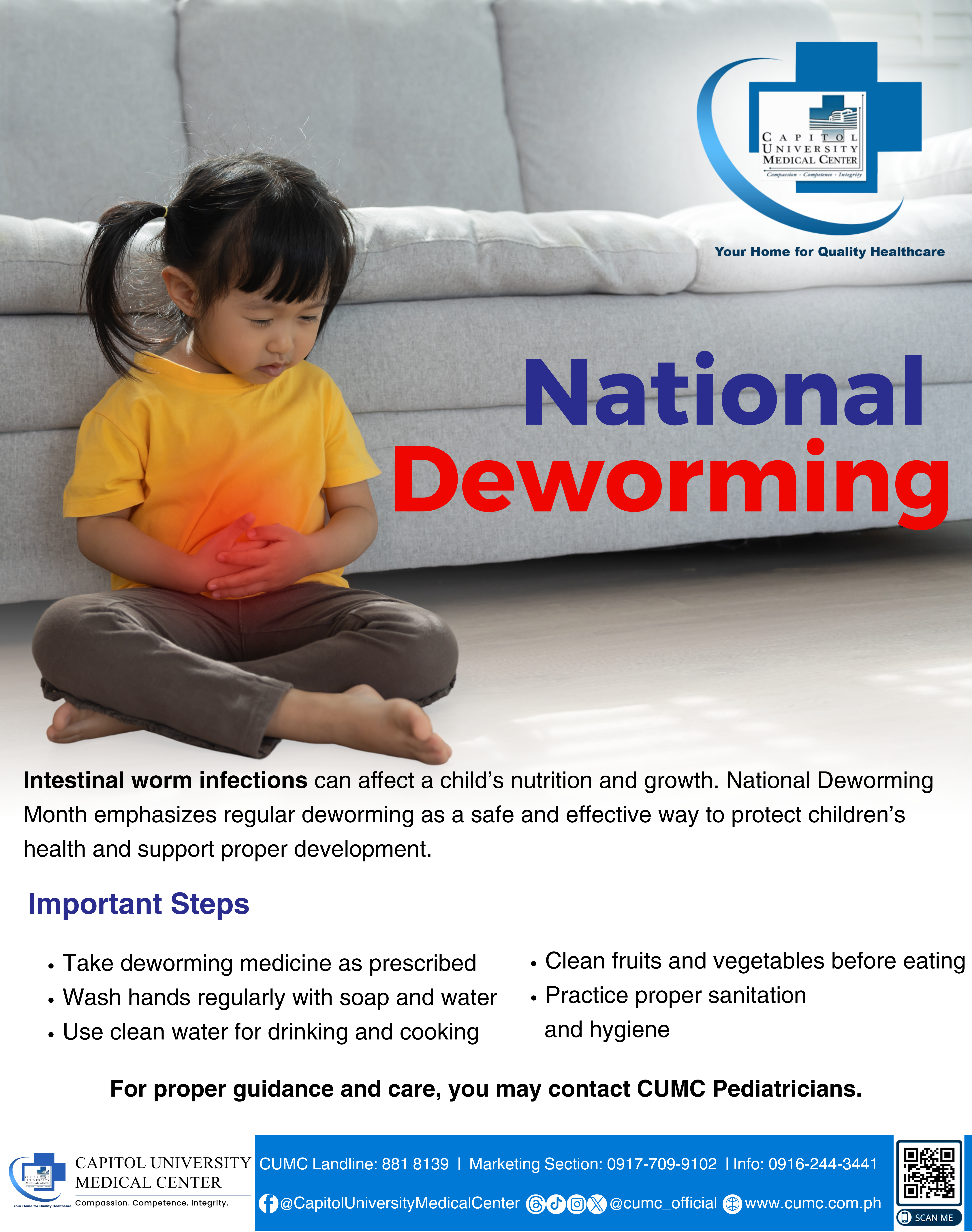 This National Deworming Month, Capitol University Medical Center (CUMC) joins the nationwide effort to protect children from intestinal worms that can affect their growth, nutrition, and overall well-being. ๐๐๐ ๐ฎ๐ฅ๐๐ซ ๐๐๐ฐ๐จ๐ซ๐ฆ๐ข๐ง๐ ๐ข๐ฌ ๐ ๐ฌ๐๐๐ ๐๐ง๐ ๐๐๐๐๐๐ญ๐ข๐ฏ๐ ๐ฐ๐๐ฒ ๐ญ๐จ ๐ก๐๐ฅ๐ฉ ๐๐ก๐ข๐ฅ๐๐ซ๐๐ง ๐ฌ๐ญ๐๐ฒ ๐ก๐๐๐ฅ๐ญ๐ก๐ฒ, ๐๐๐ญ๐ข๐ฏ๐, ๐๐ง๐ ๐ซ๐๐๐๐ฒ ๐ญ๐จ ๐ฅ๐๐๐ซ๐ง.