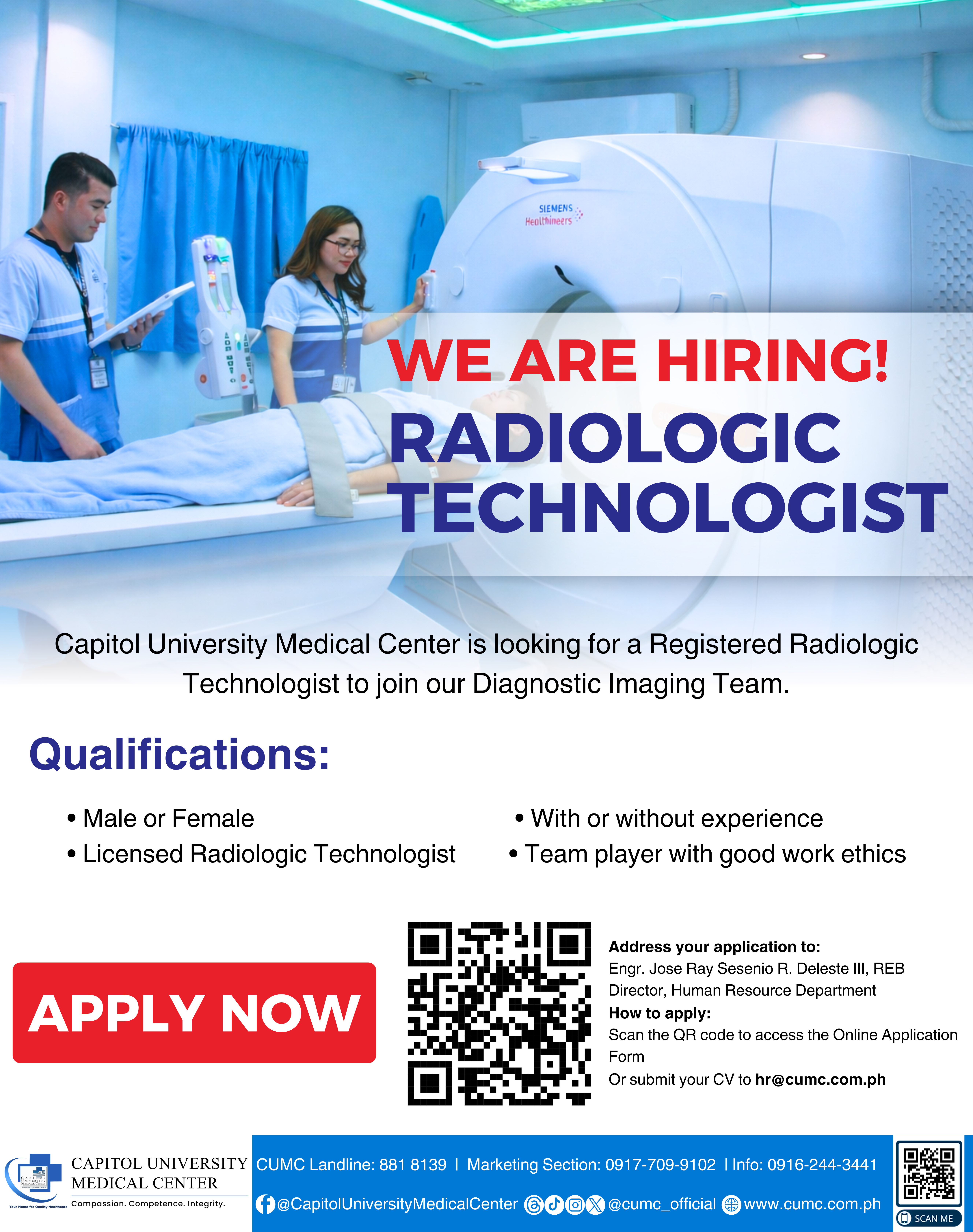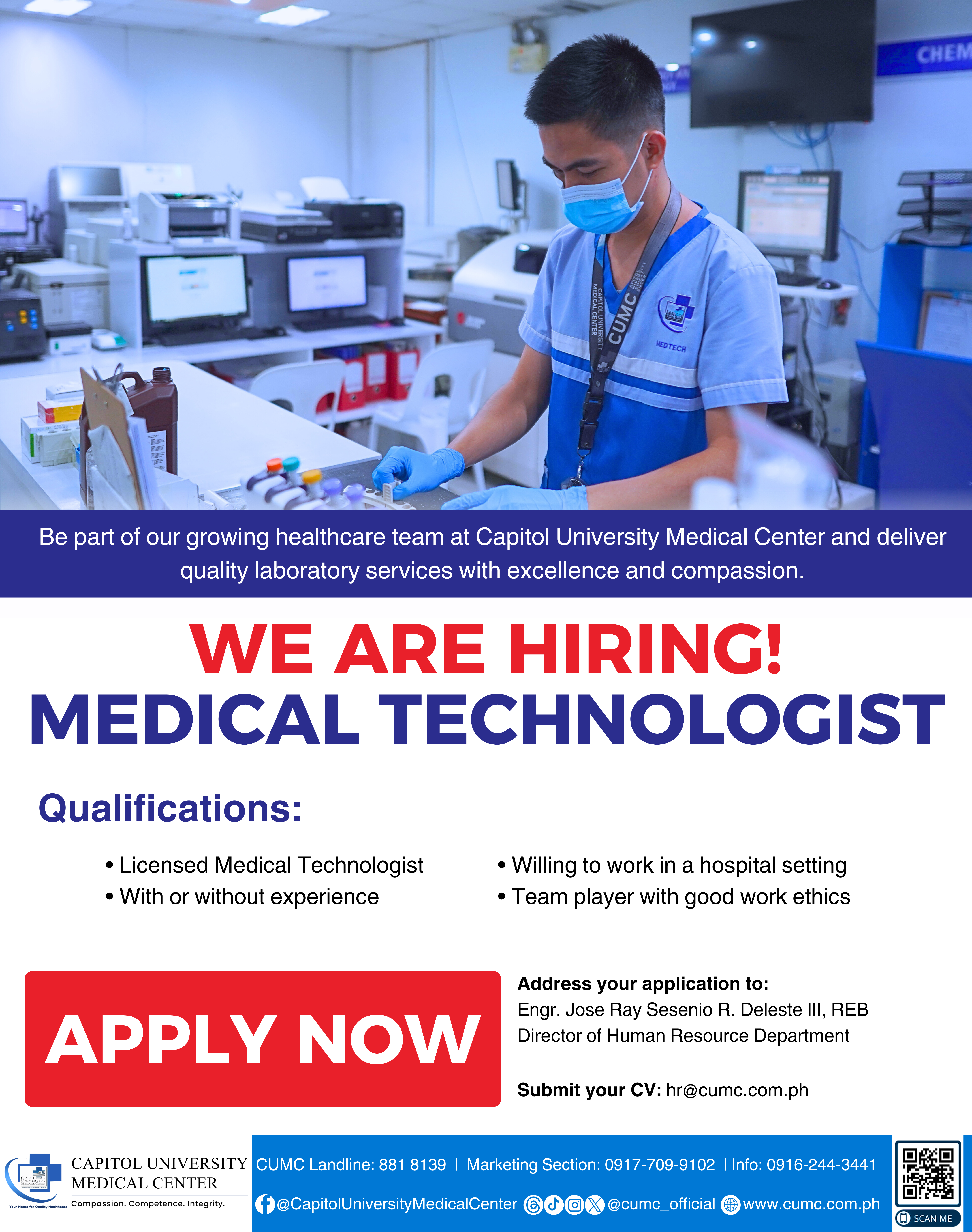 If youโre passionate about making a difference and ready to grow in a supportive environment, WEโD LOVE TO HAVE YOU ON OUR TEAM! Fresh graduate or experienced- your journey starts here at CUMC! Join our growing family, where passion meets purpose and care comes from the heart. You may send your application to [email protected] or access the Online Application by scanning the QR Code. APPLY NOW!